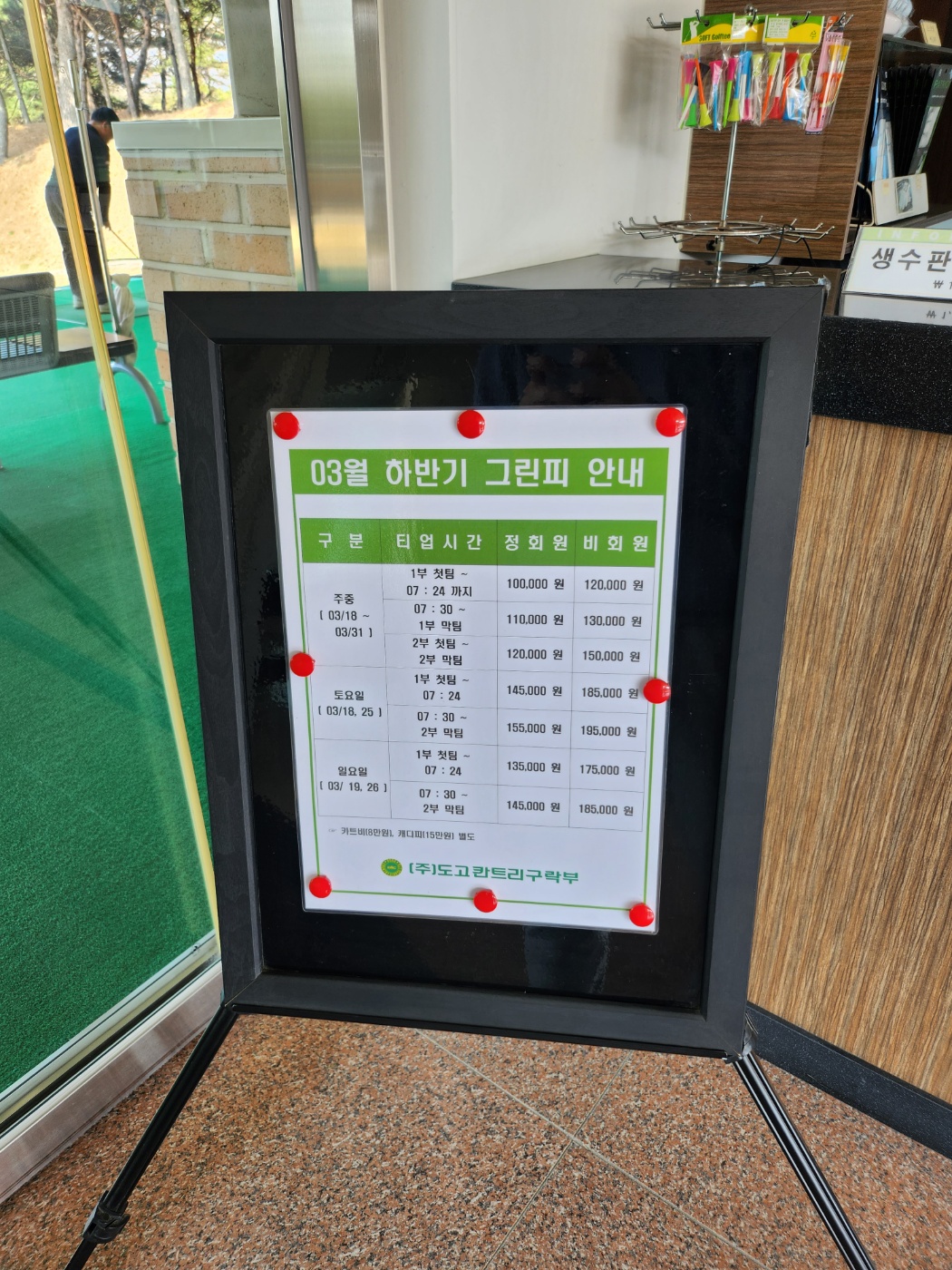 도고CC 3월 그린피도 참고하라고 안내표가 입구에 있네요 ^^
